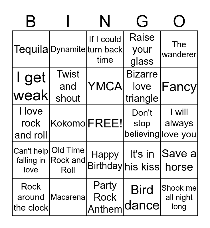 This bingo card has a free space and 24 words: Old Time Rock and Roll, Macarena, YMCA, Rock around the clock, The wanderer, Tequila, I get weak, Dynamite, Don't stop believing, Happy Birthday, Bizarre love triangle, I love rock and roll, It's in his kiss, Save a horse, Twist and shout, Bird dance, I will always love you, If I could turn back time, Fancy, Kokomo, Shook me all night long, Can't help falling in love, Raise your glass and Party Rock Anthem.