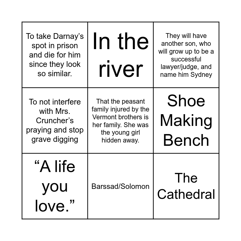 This bingo card has a free space and 8 words: Shoe Making Bench, They will have another son, who will grow up to be a successful lawyer/judge, and name him Sydney, In the river, “A life you love.”, To take Darnay’s spot in prison and die for him since they look so similar., The Cathedral, To not interfere with Mrs. Cruncher’s praying and stop grave digging and Barssad/Solomon.