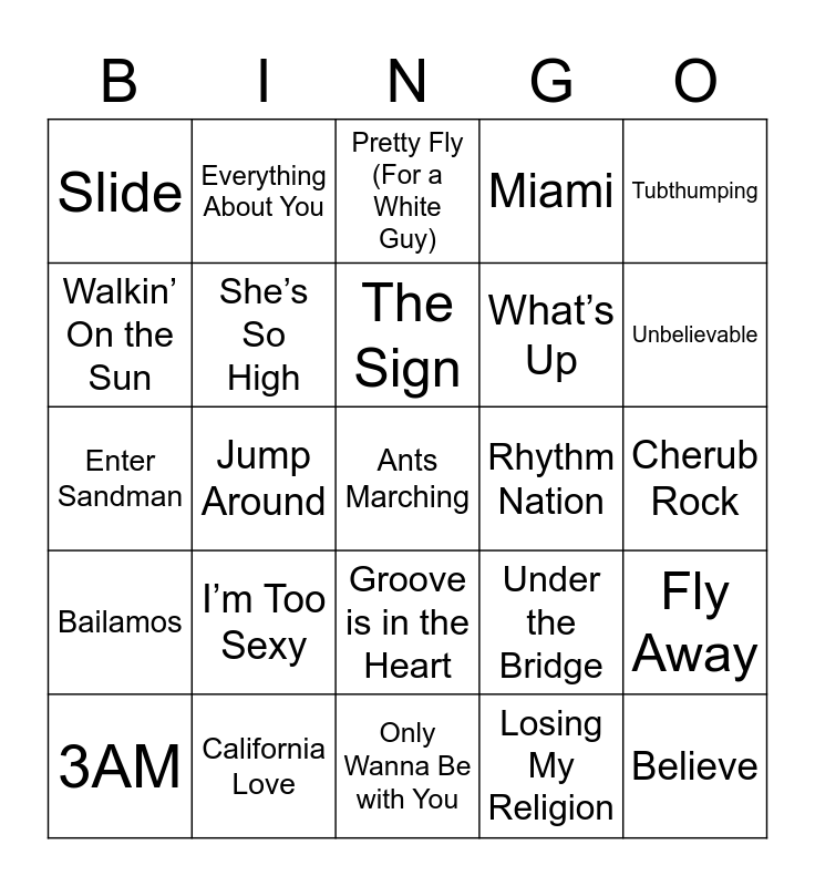 This bingo card has a free space and 24 words: I’m Too Sexy, California Love, The Sign, 3AM, Tubthumping, Slide, Walkin’ On the Sun, Everything About You, Rhythm Nation, Groove is in the Heart, What’s Up, Enter Sandman, Under the Bridge, Fly Away, She’s So High, Losing My Religion, Cherub Rock, Pretty Fly (For a White Guy), Unbelievable, Jump Around, Believe, Bailamos, Miami and Only Wanna Be with You.