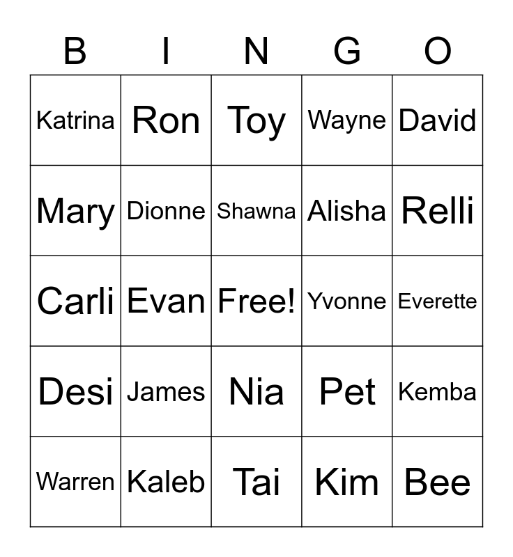 This bingo card has a free space and 39 words: Norma, Tan, Renard, Dionne, Warren, Nia, Shawna, Aisha, David, Desi, Evan, Wayne, Bee, Everette, Yvonne, James, Derrick, Katrina, Lin, Pet, Mary, Tai, Alisha, Relli, Tina, Tai, Gabrielle, Morgon, Mila, Ron, Breona, Jimmy, Toy, Kaleb, Kim, Mica, Kemba, Carli and Lonnie.