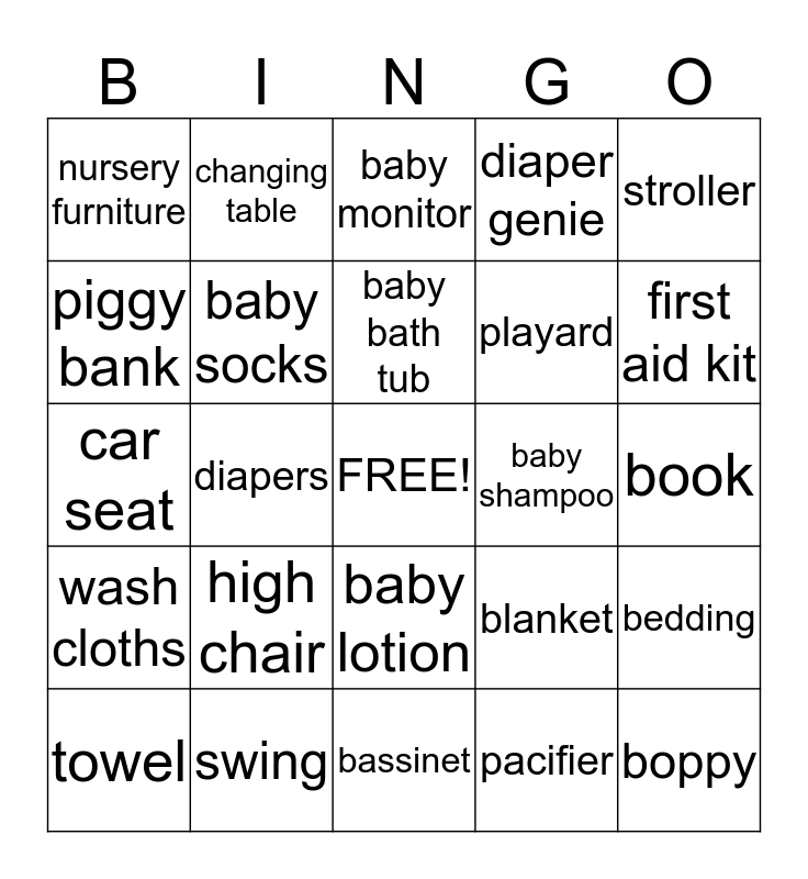 This bingo card has a free space and 32 words: pacifier, onesie, diapers, toy, wash cloths, baby socks, stroller, bedding, changing table, diaper bag, baby bath tub, baby monitor, bottle, baby wipes, baby shampoo, bib, towel, car seat, baby lotion, high chair, blanket, baby carrier, book, swing, boppy, diaper genie, playard, piggy bank, nursery furniture, bassinet, bumbo seat and first aid kit.