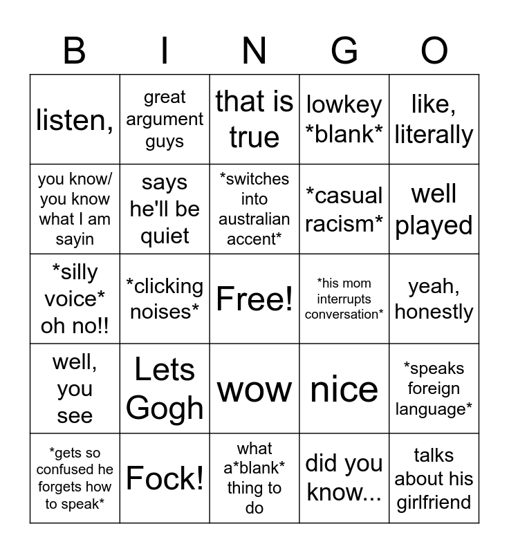 This bingo card has a free space and 24 words: Lets Gogh, Fock!, *switches into australian accent*, *gets so confused he forgets how to speak*, like, literally, listen,, you know/ you know what I am sayin, great argument guys, *his mom interrupts conversation*, wow, *casual racism*, *silly voice* oh no!!, nice, *speaks foreign language*, says he'll be quiet, did you know..., yeah, honestly, that is true, well played, *clicking noises*, talks about his girlfriend, well, you see, lowkey *blank* and what a*blank* thing to do.