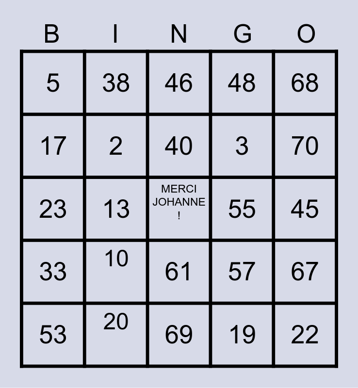 This bingo card has a free space and 24 words: 10, 20, 40, 53, 68, 5, 17, 38, 55, 61, 3, 23, 57, 67, 2, 19, 45, 46, 70, 13, 22, 33, 48 and 69.
