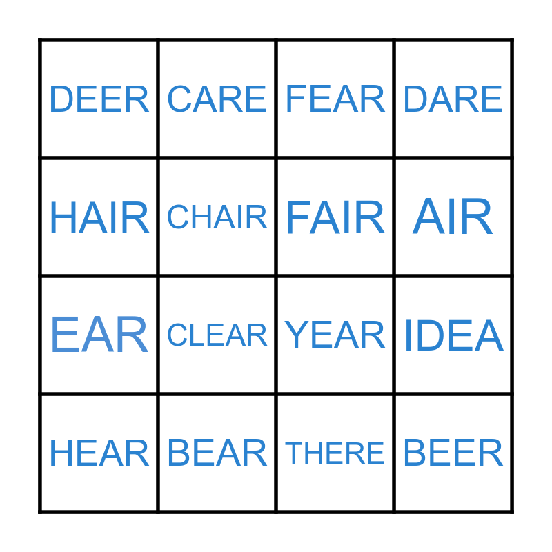 This bingo card has 16 words: BEAR, IDEA, FEAR, DEER, EAR, CARE, YEAR, THERE, HAIR, CHAIR, HEAR, DARE, CLEAR, AIR, FAIR and BEER.
