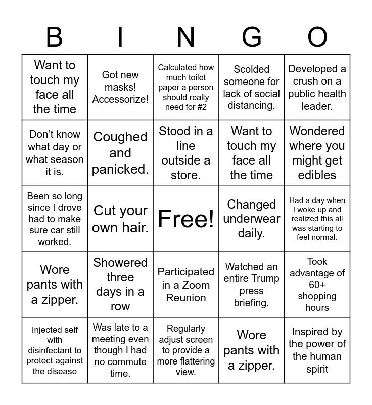 This bingo card has a free space and 36 words: Sang happy birthday while washing hands., Got teary listening to Dr. Amy Acton., Participated in a Zoom meeting pant-less., Coughed and panicked., Watched an entire Trump press briefing., Wore pants with a zipper., Stood in a line outside a store., Waved excitedly at a neighbor passing by., Developed a crush on a public health leader., Pontificated about Biden’s VP choice., Cut your own hair., Scolded someone for lack of social distancing., Binge-watched on Netflix., Changed underwear daily., Wondered where you might get edibles, Want to touch my face all the time, Consider myself partially responsible for Ohio’s 50% increase in liquor sales., Showered three days in a row, Inspired by the power of the human spirit, Calculated how much toilet paper a person should really need for #2, Had a day when I woke up and realized this all was starting to feel normal., Took advantage of 60+ shopping hours, Was late to a meeting even though I had no commute time., Injected self with disinfectant to protect against the disease, Regularly adjust screen to provide a more flattering view., Got new masks! Accessorize!, Been so long since I drove had to make sure car still worked., Freak out when I see people shake hands in movies and tv shows., Want to touch my face all the time, Don’t know what day or what season it is., Don’t even know where the bra is anymore., Distance-celebrated a major milestone., Wore pants with a zipper., Participated in a Zoom Reunion, Secretly mute people when hosting a Zoom meeting. and B.