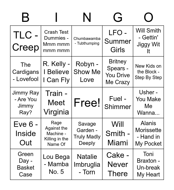 This bingo card has a free space and 28 words: Alanis Morissette - Hand in My Pocket, Backstreet Boys - Everybody, Britney Spears - You Drive Me Crazy, Cake - Never There, The Cardigans - Lovefool, Chumbawamba - Tubthumping, Crash Test Dummies - Mmm mmm mmm mmm, Eve 6 - Inside Out, Fuel - Shimmer, Green Day - Basket Case, Jimmy Ray - Are You Jimmy Ray?, LFO - Summer Girls, Lou Bega - Mamba No. 5, Natalie Imbruglia - Torn, New Kids on the Block - Step By Step, NSYNC - Bye Bye Bye, Rage Against the Machine - Killing in the Name Of, R. Kelly - I Believe I Can Fly, Robyn - Show Me Love, Savage Garden - Truly Madly Deeply, TLC - Creep, TLC - No Scrubs, Toni Braxton - Un-break My Heart, Train - Meet Virginia, Usher - You Make Me Wanna..., Will Smith - Miami, Will Smith - Gettin' Jiggy Wit It and Wycleaf Jean - Gone Till November.