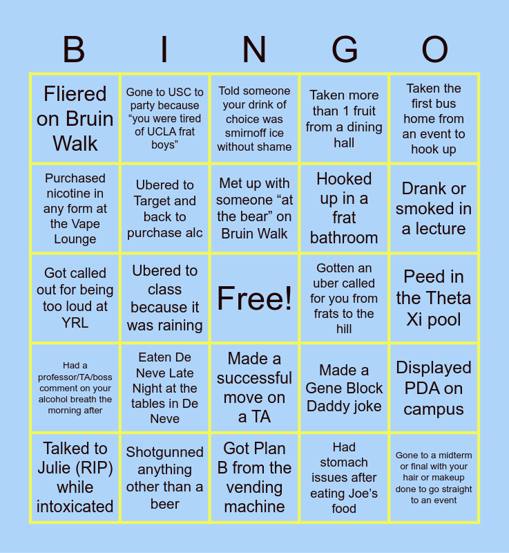 This bingo card has a free space and 24 words: Eaten De Neve Late Night at the tables in De Neve, Shotgunned anything other than a beer, Met up with someone “at the bear” on Bruin Walk, Talked to Julie (RIP) while intoxicated, Taken the first bus home from an event to hook up, Fliered on Bruin Walk, Purchased nicotine in any form at the Vape Lounge, Gone to USC to party because “you were tired of UCLA frat boys”, Gotten an uber called for you from frats to the hill, Made a successful move on a TA, Hooked up in a frat bathroom, Got called out for being too loud at YRL, Made a Gene Block Daddy joke, Displayed PDA on campus, Ubered to Target and back to purchase alc, Had stomach issues after eating Joe’s food, Peed in the Theta Xi pool, Told someone your drink of choice was smirnoff ice without shame, Drank or smoked in a lecture, Ubered to class because it was raining, Gone to a midterm or final with your hair or makeup done to go straight to an event, Had a professor/TA/boss comment on your alcohol breath the morning after, Taken more than 1 fruit from a dining hall and Got Plan B from the vending machine.