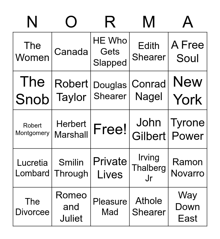 This bingo card has a free space and 44 words: Irving Thalberg, Way Down East, MGM, The Divorcee, Marie Antoinette, Athole Shearer, HE Who Gets Slapped, Lady of the Night, A Free Soul, Romeo and Juliet, Edith Shearer, John Gilbert, Private Lives, Smilin Through, Miss Lotta Miles, Pleasure Mad, Lady of Chance, Robert Montgomery, Idiots Delight, New York, Canada, The Demi-Bride, Academy Award, The Women, Martin Arrouge, Tyrone Power, Leslie Howard, Escape, Irving Thalberg Jr, Lucretia Lombard, The Student Prince in Old Heidelberg, Ramon Novarro, Clark Gable, Riptide, Herbert Marshall, Pre-code, Katharine Thalberg, Montreal Quebec Canada, Douglas Shearer, The Snob, Conrad Nagel, Johnny Mack Brown, Robert Taylor and Melvyn Douglas.
