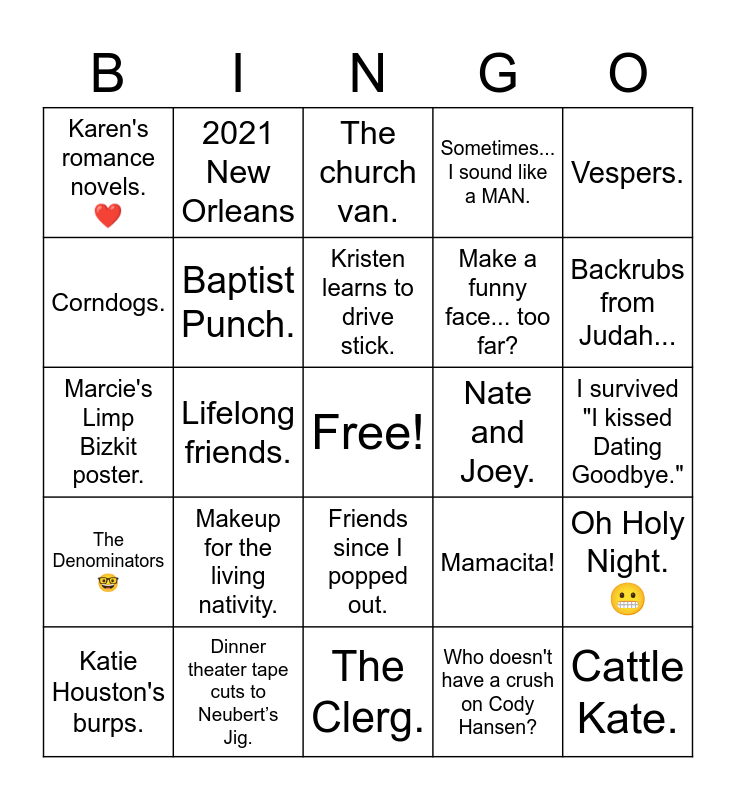 This bingo card has a free space and 54 words: The decibel of a Matt Whipps' Scream., The Denominators🤓, The Junior High Girls Eyeroll., The cops just busted our game night., Friends since I popped out., Jess falling backwards off the porch and being folded in a folding chair., Sometimes... I sound like a MAN., Denim Underwear., Corndogs., Wes Connell's mullet., Karen's romance novels. ❤️, This is our friend... uhh... Kristen., Dinner theater tape cuts to Neubert’s Jig., Katie Houston's burps., Brandon's hair still has sand in it., The Clerg., Cattle Kate., Make a funny face... too far?, Roy Forbis flare., I survived "I kissed Dating Goodbye.", Mamacita!, 10 on Sunday., Nate and Joey., Vespers., "Speak to me.." Sorry a bubble., 2021 New Orleans, Drunk Kathleen at Marcie's Wedding., Hairspray..., Jess is grounded from being late from Meals on Wheels., Who doesn't have a crush on Cody Hansen?, Surge, The holiday toilet paper., Camp Wyoba., Get down with your bad self., The church van., Nancy just found Amy's bong in a stuffed animal., Marcie's Limp Bizkit poster., Oh Holy Night. 😬, We've known Kristen since she was concieved., Baptist Punch., The Fellowship Hall., White Christmas 🎄, I'm glad she's getting out there and spreading her legs..., Jess's bucket hats., Makeup for the living nativity., Nike bit me., Amy’s massage that broke Kristen., Jess has diarrhea. 💩, Kristen learns to drive stick., Lifelong friends., Backrubs from Judah..., Taco Bell 🔔., Love Shack. and Philosophical late night talks..