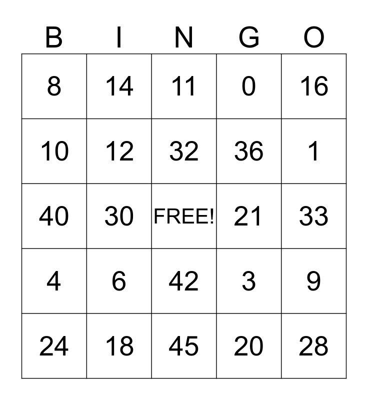 This bingo card has a free space and 24 words: 6, 18, 32, 24, 16, 8, 10, 14, 21, 42, 36, 40, 3, 9, 12, 20, 33, 11, 1, 30, 28, 4, 0 and 45.