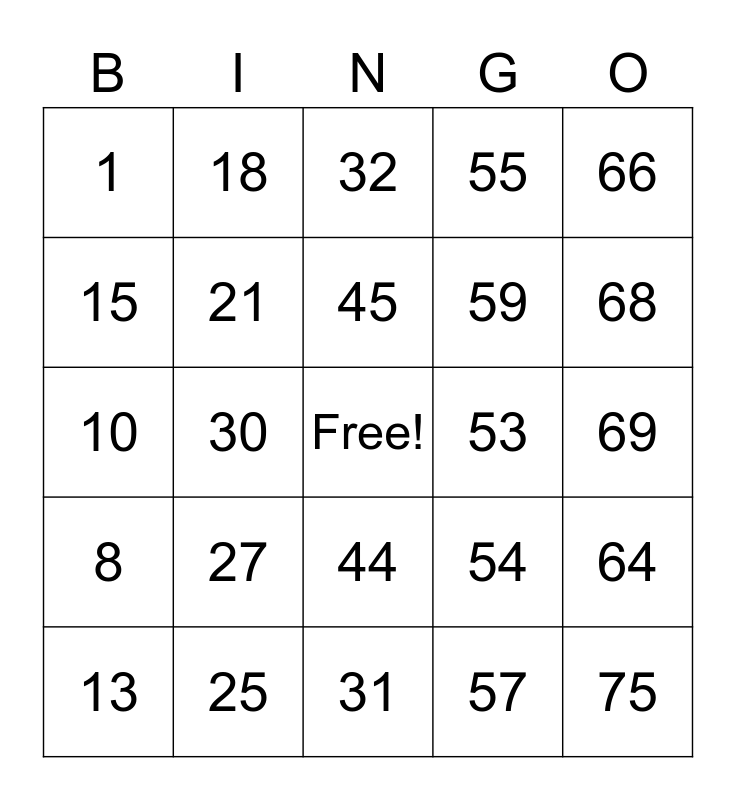 This bingo card has a free space and 24 words: 13, 27, 45, 57, 66, 1, 18, 32, 53, 69, 10, 21, 54, 64, 15, 25, 31, 55, 68, 8, 30, 44, 59 and 75.