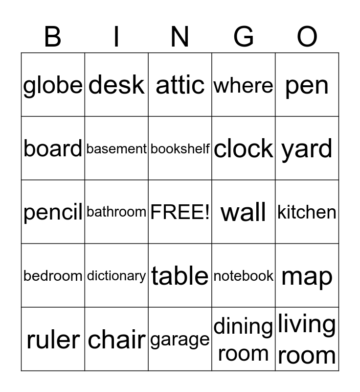 This bingo card has a free space and 24 words: dictionary, chair, bookshelf, ruler, pen, globe, board, desk, wall, table, clock, pencil, notebook, map, basement, dining room, kitchen, attic, yard, bathroom, living room, bedroom, where and garage.