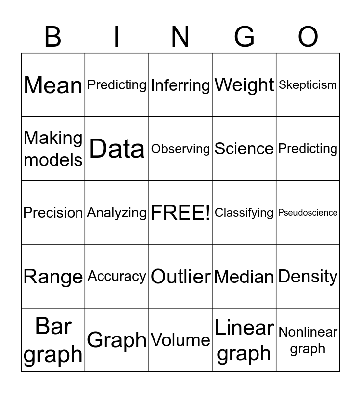This bingo card has a free space and 24 words: Accuracy, Graph, Observing, Bar graph, Skepticism, Mean, Making models, Predicting, Classifying, Outlier, Science, Precision, Median, Density, Data, Linear graph, Pseudoscience, Inferring, Predicting, Analyzing, Nonlinear graph, Range, Weight and Volume.