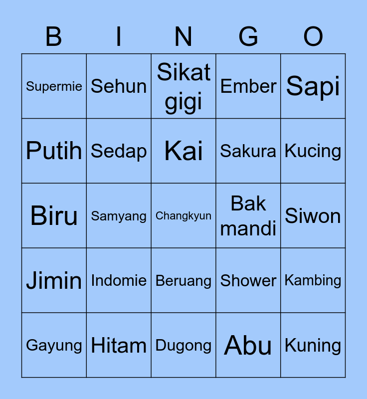This bingo card has a free space and 24 words: Indomie, Hitam, Kai, Gayung, Sapi, Supermie, Putih, Sehun, Bak mandi, Beruang, Sakura, Biru, Shower, Kambing, Sedap, Abu, Siwon, Sikat gigi, Kucing, Samyang, Kuning, Jimin, Ember and Dugong.