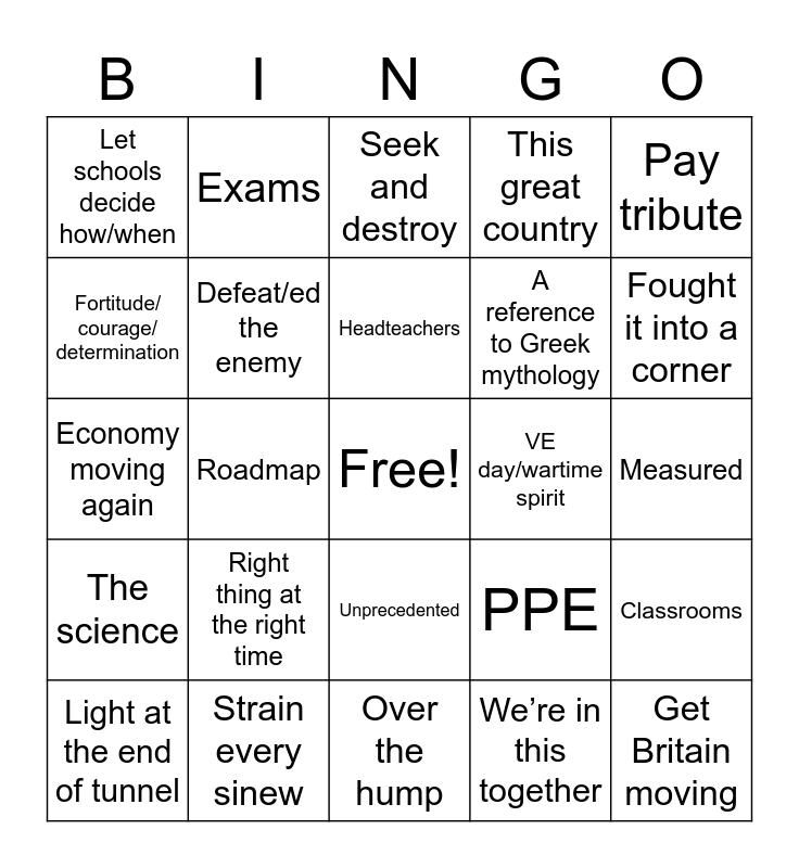 This bingo card has a free space and 40 words: Heroes, Economy moving again, Errrh. Ahhh. (or similar noises), Defeat/ed the enemy, Strain every sinew, Unprecedented, Headteachers, Flattened the curve, Pay tribute, The science, Roadmap, This great country, Get Britain moving, Measured, VE day/wartime spirit, Right thing at the right time, Charting a course, Let schools decide how/when, Get children back to school, Seek and destroy, Classrooms, We’re in this together, A reference to Greek mythology, Fortitude/ courage/ determination, Garden centres, Phased Approach, Past the peak, A latin quote, Ramping up testing, Be Alert, Tremendous sacrifice, Light at the end of tunnel, Protect the NHS, PPE, Fought it into a corner, Over the hump, Together, Unleash, Exams and Spirit.