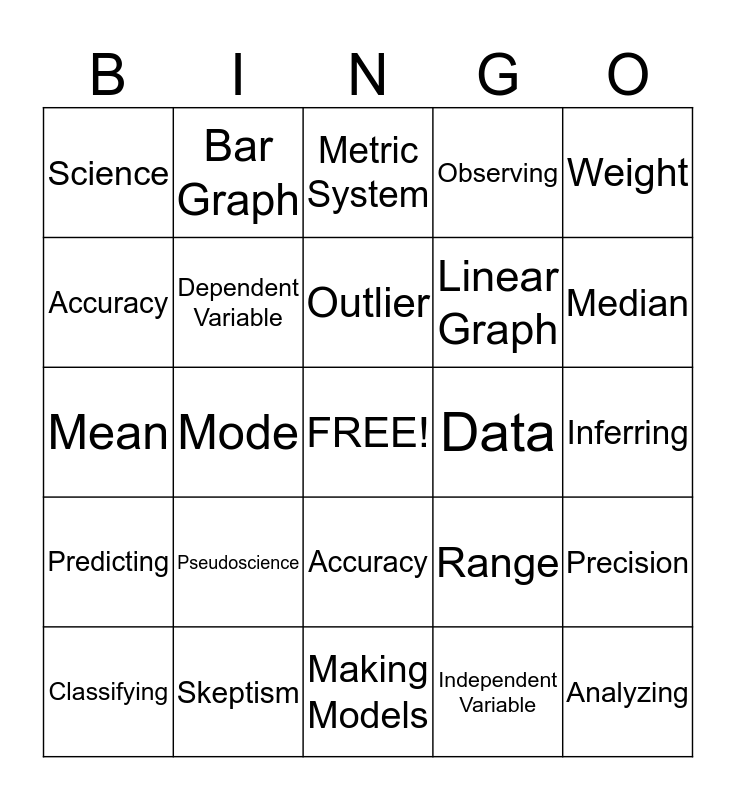 This bingo card has a free space and 24 words: Pseudoscience, Skeptism, Outlier, Classifying, Weight, Science, Accuracy, Bar Graph, Data, Accuracy, Linear Graph, Mean, Range, Precision, Dependent Variable, Independent Variable, Inferring, Metric System, Median, Mode, Analyzing, Predicting, Observing and Making Models.