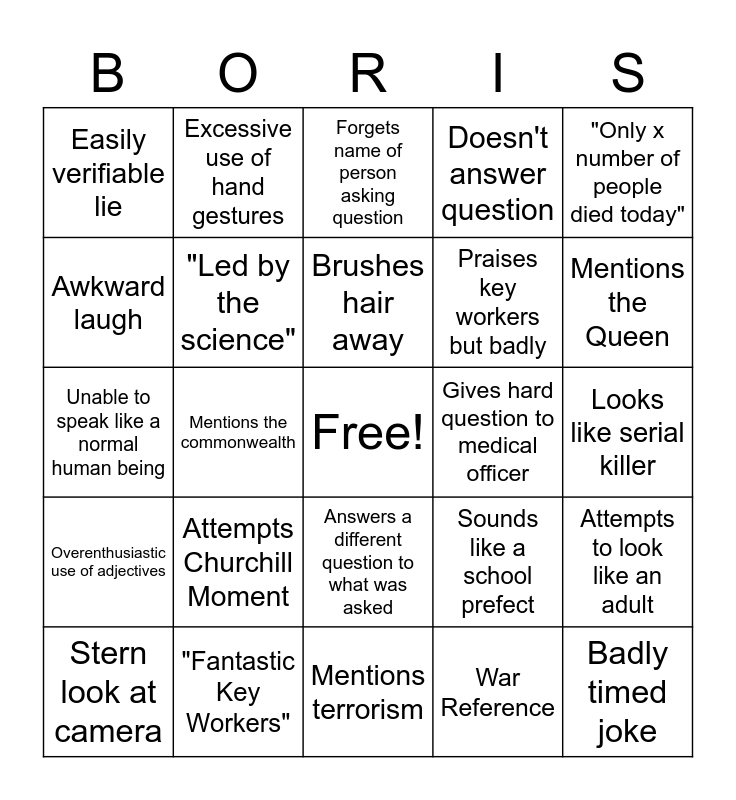 This bingo card has a free space and 24 words: Attempts Churchill Moment, "Fantastic Key Workers", Brushes hair away, Stern look at camera, "Only x number of people died today", Easily verifiable lie, Awkward laugh, Excessive use of hand gestures, Gives hard question to medical officer, Answers a different question to what was asked, Praises key workers but badly, Unable to speak like a normal human being, Sounds like a school prefect, Attempts to look like an adult, "Led by the science", War Reference, Looks like serial killer, Forgets name of person asking question, Mentions the Queen, Mentions the commonwealth, Badly timed joke, Overenthusiastic use of adjectives, Doesn't answer question and Mentions terrorism.