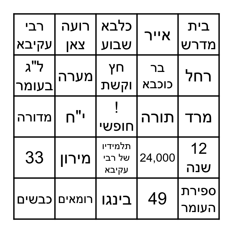 This bingo card has a free space and 24 words: מירון, רומאים, חץ וקשת, כבשים, בית מדרש, רבי עקיבא, ל"ג בעומר, רועה צאן, תורה, תלמידיו של רבי עקיבא, בר כוכבא, מדורה, 24,000, 12 שנה, מערה, 49, מרד, כלבא שבוע, רחל, י"ח, ספירת העומר, 33, אייר and בינגו.