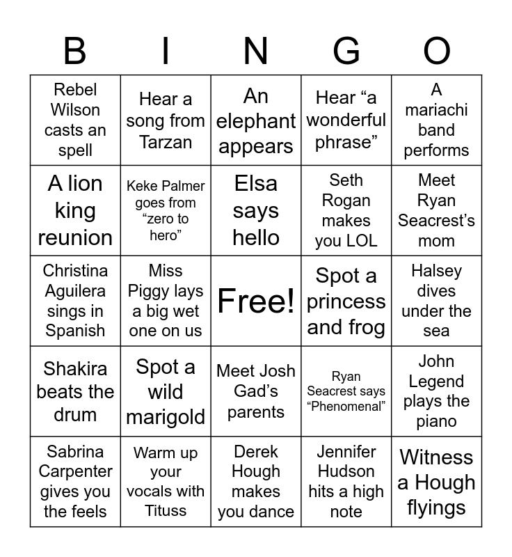 This bingo card has a free space and 24 words: Spot a wild marigold, Warm up your vocals with Tituss, Elsa says hello, Sabrina Carpenter gives you the feels, A mariachi band performs, Rebel Wilson casts an spell, A lion king reunion, Hear a song from Tarzan, Spot a princess and frog, Meet Josh Gad’s parents, Seth Rogan makes you LOL, Christina Aguilera sings in Spanish, Ryan Seacrest says “Phenomenal”, John Legend plays the piano, Keke Palmer goes from “zero to hero”, Jennifer Hudson hits a high note, Halsey dives under the sea, An elephant appears, Meet Ryan Seacrest’s mom, Miss Piggy lays a big wet one on us, Witness a Hough flyings, Shakira beats the drum, Hear “a wonderful phrase” and Derek Hough makes you dance.