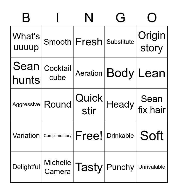 This bingo card has 26 words: Free!, Punchy, Aeration, Michelle Camera, Origin story, What's uuuup, Sean hunts, Smooth, Sean fix hair, Drinkable, Body, Aggressive, Soft, Delightful, Round, Local, Substitute, Variation, Fresh, Quick stir, Lean, Tasty, Heady, Complimentary, Cocktail cube and Unrivalable.
