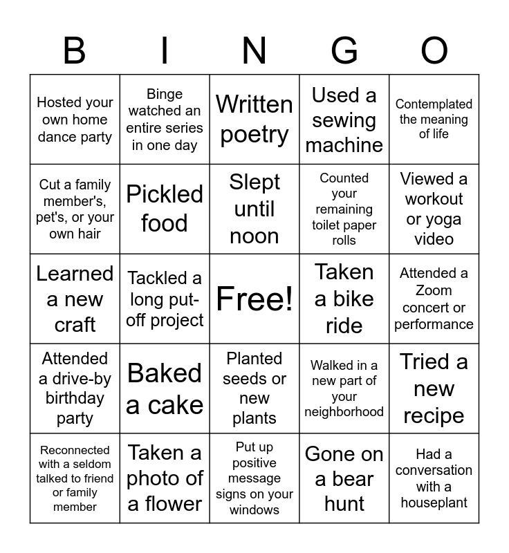 This bingo card has a free space and 24 words: Baked a cake, Taken a photo of a flower, Slept until noon, Reconnected with a seldom talked to friend or family member, Contemplated the meaning of life, Hosted your own home dance party, Cut a family member's, pet's, or your own hair, Binge watched an entire series in one day, Taken a bike ride, Planted seeds or new plants, Counted your remaining toilet paper rolls, Learned a new craft, Walked in a new part of your neighborhood, Tried a new recipe, Pickled food, Gone on a bear hunt, Attended a Zoom concert or performance, Written poetry, Viewed a workout or yoga video, Tackled a long put-off project, Had a conversation with a houseplant, Attended a drive-by birthday party, Used a sewing machine and Put up positive message signs on your windows.