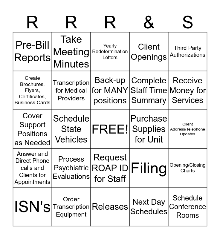 This bingo card has a free space and 24 words: Process Psychiatric Evaluations, Order Transcription Equipment, Back-up for MANY positions, ISN's, Third Party Authorizations, Pre-Bill Reports, Create Brochures, Flyers, Certificates, Business Cards, Take Meeting Minutes, Purchase Supplies for Unit, Request ROAP ID for Staff, Complete Staff Time Summary, Cover Support Positions as Needed, Filing, Opening/Closing Charts, Transcription for Medical Providers, Next Day Schedules, Client Address/Telephone Updates, Yearly Redetermination Letters, Receive Money for Services, Schedule State Vehicles, Schedule Conference Rooms, Answer and Direct Phone calls and Clients for Appointments, Client Openings and Releases.