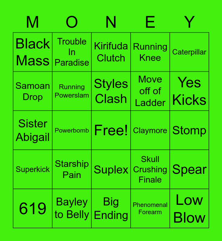 This bingo card has a free space and 24 words: 619, Starship Pain, Styles Clash, Phenomenal Forearm, Caterpillar, Black Mass, Trouble In Paradise, Kirifuda Clutch, Claymore, Stomp, Sister Abigail, Running Powerslam, Skull Crushing Finale, Spear, Samoan Drop, Bayley to Belly, Big Ending, Running Knee, Yes Kicks, Superkick, Powerbomb, Suplex, Move off of Ladder and Low Blow.