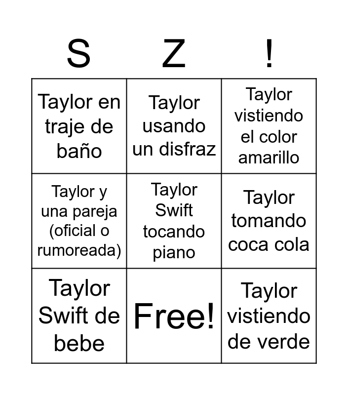 This bingo card has a free space and 8 words: Taylor tomando coca cola, Taylor vistiendo el color amarillo, Taylor usando un disfraz, Taylor Swift de bebe, Taylor en traje de baño, Taylor vistiendo de verde, Taylor y una pareja (oficial o rumoreada) and Free!.
