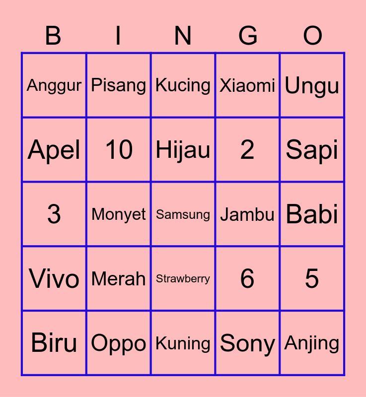 This bingo card has 25 words: Merah, Kuning, Hijau, Biru, Ungu, Anggur, Apel, Pisang, Jambu, Strawberry, 2, 3, 6, 5, 10, Anjing, Babi, Kucing, Sapi, Monyet, Samsung, Oppo, Vivo, Xiaomi and Sony.