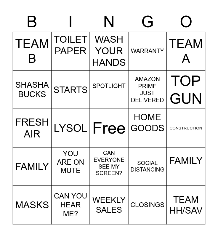 This bingo card has a free space and 24 words: YOU ARE ON MUTE, CAN YOU HEAR ME?, SPOTLIGHT, MASKS, TEAM A, TEAM B, SHASHA BUCKS, TOILET PAPER, HOME GOODS, CAN EVERYONE SEE MY SCREEN?, AMAZON PRIME JUST DELIVERED, FRESH AIR, SOCIAL DISTANCING, FAMILY, STARTS, CLOSINGS, CONSTRUCTION, WASH YOUR HANDS, TOP GUN, LYSOL, TEAM HH/SAV, FAMILY, WARRANTY and WEEKLY SALES.