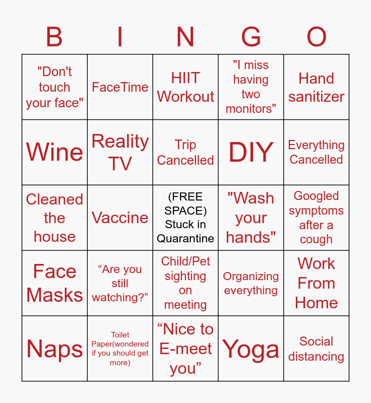 This bingo card has a free space and 60 words: Pj's, Toilet Paper(wondered if you should get more), Wifi Connection, Face Masks, Yoga, Snacks (ate them all), Reality TV, Tiger King, DIY, Business top with questionable pants, "I miss having two monitors", *Screen froze*, Wine, "I think you're muted", Zoom, "Don't touch your face", Social distancing, Hand sanitizer, Virtual Happy Hours, Trip Cancelled, "Wash your hands", HIIT Workout, Naps, Work From Home, Back to Back Calls, Cabin Fever, Take out/Away, RIP Sports, Everything Cancelled, World Health Organization, Bleach, Only hear every fifth word on this call but get the gist, Talking to yourself, Time losing all meaning, FaceTime, Houseparty (the app), Quarantine, Vaccine, Stay at Home, Cleaned the house, Water bottles as dumbbells, “Are you still watching?”, Googled symptoms after a cough, Consider selling your kids, spouse or roommate, Organizing everything, Online Shopping, conversations with pets or objects, Slacking meme’s, Too much snacking, Child/Pet sighting on meeting, “Nice to E-meet you”, “Can you hear me now?”, Someone typing possibly with a hammer, No rush hour traffic, Stepping out for fresh air, Close the fridge, it’s tempting, Cooking new recipes, Bored children, Puzzles and 'Home schooling'.
