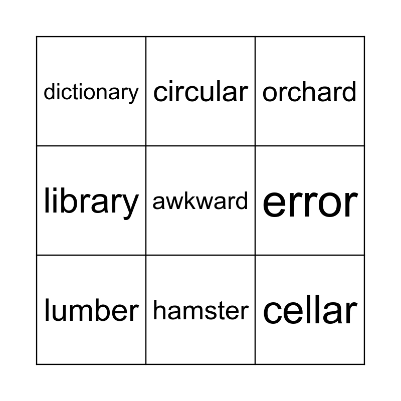 This bingo card has 9 words: lumber, orchard, circular, library, dictionary, error, awkward, cellar and hamster.