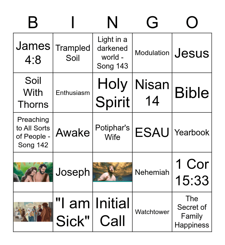 This bingo card has 5 images and 41 words: Free!, Potiphar's Wife, Baptism, Initial Call, Joseph, Fine Soil, Trampled Soil, Rocky Soil, Soil With Thorns, Accurate Reading, Enthusiasm, Modulation, 1 Cor 15:33, Nehemiah, Ten Virgins, Jacob, Holy Spirit, ESAU, Jehovah, Jesus, Awake, Watchtower, James 4:8, Nisan 14, 144,000, Bible, ...and the wicked will be no more., ...and death will be no more, ...and it alone will stand forever, ...and he will reside with them, and they will be his ppl, "I am Sick", Yearbook, Gods Kingdom Rule, Pure Worship - Restored At last!, Imitate Their Faith, The Secret of Family Happiness, Light in a darkened world - Song 143, Preaching to All Sorts of People - Song 142, Grant Us Boldness - Song 137, God is Love - Song 3 and Here I am! Send Me - song 10.