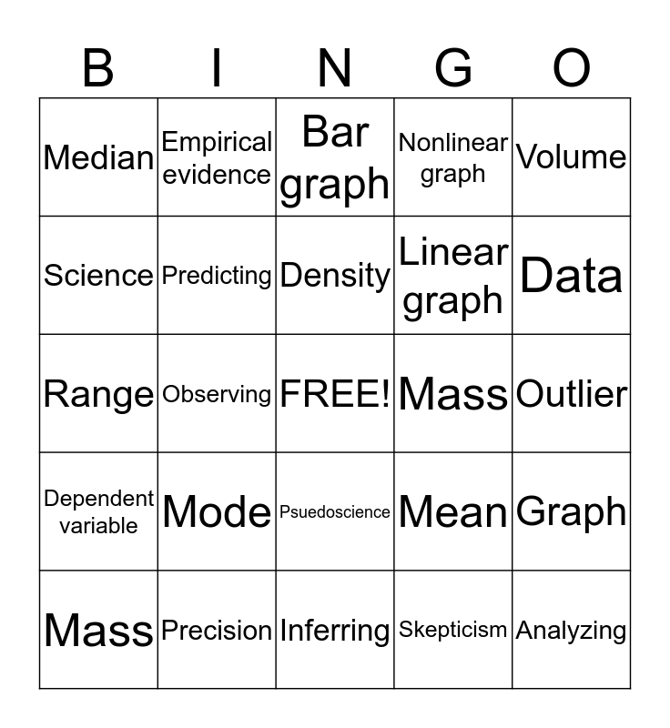 This bingo card has a free space and 24 words: Mode, Precision, Density, Mass, Volume, Median, Science, Empirical evidence, Mass, Psuedoscience, Linear graph, Range, Mean, Graph, Predicting, Skepticism, Outlier, Bar graph, Data, Observing, Analyzing, Dependent variable, Nonlinear graph and Inferring.