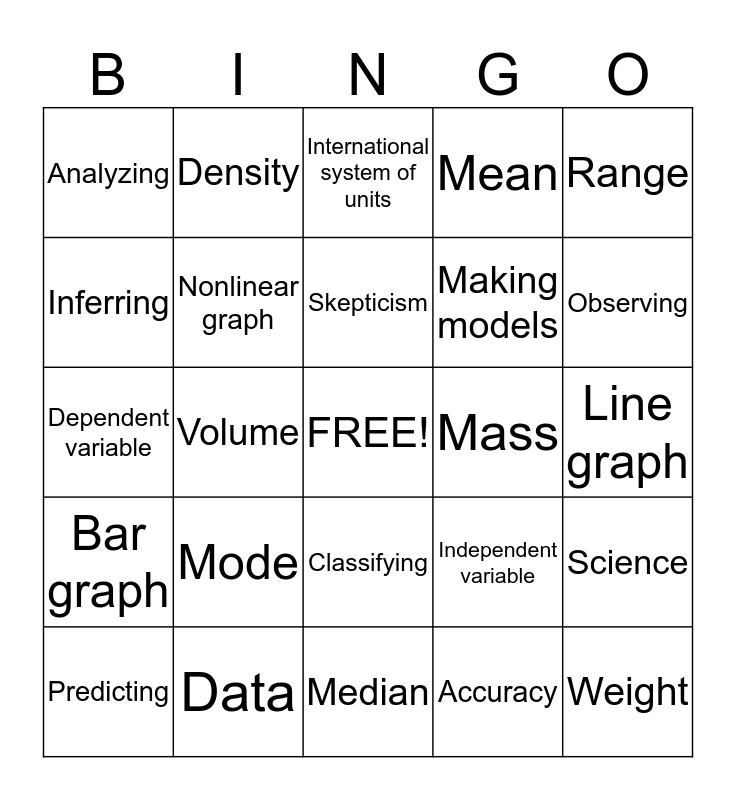 This bingo card has a free space and 24 words: Mode, Data, Skepticism, Predicting, Range, Analyzing, Inferring, Density, Mass, Classifying, Making models, Dependent variable, Independent variable, Science, Nonlinear graph, Accuracy, Line graph, International system of units, Observing, Volume, Weight, Bar graph, Mean and Median.