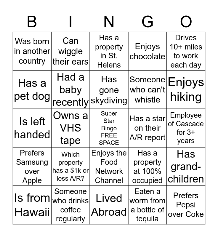 This bingo card has a free space and 24 words: Which property has a $1k or less A/R?, Someone who drinks coffee regularly, Has gone skydiving, Is from Hawaii, Drives 10+ miles to work each day, Was born in another country, Has a pet dog, Can wiggle their ears, Has a star on their A/R report, Enjoys the Food Network Channel, Someone who can't whistle, Is left handed, Has a property at 100% occupied, Has grand-children, Had a baby recently, Eaten a worm from a bottle of tequila, Employee of Cascade for 3+ years, Has a property in St. Helens, Enjoys hiking, Owns a VHS tape, Prefers Pepsi over Coke, Prefers Samsung over Apple, Enjoys chocolate and Lived Abroad.