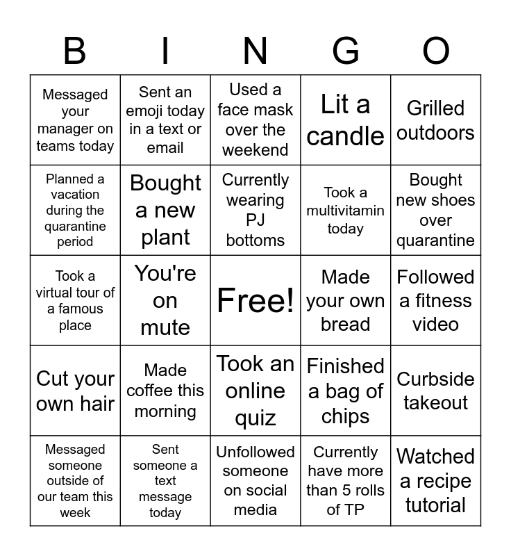 This bingo card has a free space and 24 words: Made coffee this morning, Sent someone a text message today, Currently wearing PJ bottoms, Messaged someone outside of our team this week, Grilled outdoors, Messaged your manager on teams today, Planned a vacation during the quarantine period, Sent an emoji today in a text or email, Made your own bread, Took an online quiz, Took a multivitamin today, Took a virtual tour of a famous place, Finished a bag of chips, Curbside takeout, Bought a new plant, Currently have more than 5 rolls of TP, Followed a fitness video, Used a face mask over the weekend, Bought new shoes over quarantine, You're on mute, Watched a recipe tutorial, Cut your own hair, Lit a candle and Unfollowed someone on social media.