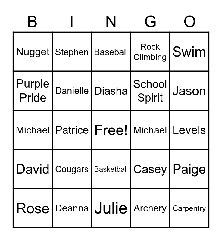 This bingo card has a free space and 24 words: Cougars, Deanna, Diasha, Rose, Swim, Nugget, Purple Pride, Stephen, Michael, Basketball, School Spirit, Michael, Casey, Paige, Danielle, Archery, Levels, Baseball, Jason, Patrice, Carpentry, David, Rock Climbing and Julie.