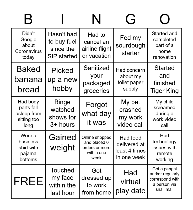 This bingo card has 39 words: Cut my own hair or of a family member, Did a live home workout class, Started a new home project, Picked up a new hobby, FREE, Online shopped and placed 6 orders or more within one week, Sanitized your packaged groceries, Haven’t bathed in 24 hours, Started and completed part of a home renovation, Wore a business shirt with pajama bottoms, Binge watched shows for 3+ hours, Fed my sourdough starter, Forgot what day it was, My child screamed during a work video call, My pet crashed my work video call, Gained weight, Had three cups of coffee/tea already, Didn’t Google about Coronavirus today, Joined Tik Tok, Had food delivered at least 4 times in one week, Baked banana bread, Got dressed up to work from home, Had concern about my toilet paper supply, Started and finished Tiger King, Didn’t leave my home for 72+ hours, Eat cereal at least once a day, Got a penpal and/or regularly correspond with a person via snail mail, Have regular video chats with friends/family, Forgot to apply deodorant, Hasn’t had to buy fuel since the SIP started, Had junk food for lunch, Started or finished a book, Had to cancel an airline flight or vacation, Touched my face within the last hour, Had virtual play date, Said "Can you hear me now?" on a video call, Had technology issues with remote working, Had body parts fall asleep from sitting too long and Left something at work that I needed for working from home.