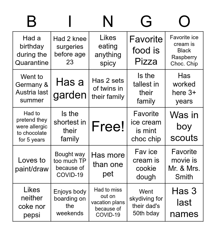 This bingo card has a free space and 24 words: Bought way too much TP because of COVID-19, Enjoys body boarding on the weekends, Has 2 sets of twins in their family, Likes neither coke nor pepsi, Favorite ice cream is Black Raspberry Choc. Chip, Had a birthday during the Quarantine, Went to Germany & Austria last summer, Had 2 knee surgeries before age 23, Favorite ice cream is mint choc chip, Has more than one pet, Is the tallest in their family, Had to pretend they were allergic to chocolate for 5 years, Fav ice cream is cookie dough, Favorite movie is Mr. & Mrs. Smith, Has a garden, Went skydiving for their dad's 50th bday, Was in boy scouts, Likes eating anything spicy, Has worked here 3+ years, Is the shortest in their family, Has 3 last names, Loves to paint/draw, Favorite food is Pizza and Had to miss out on vacation plans because of COVID-19.