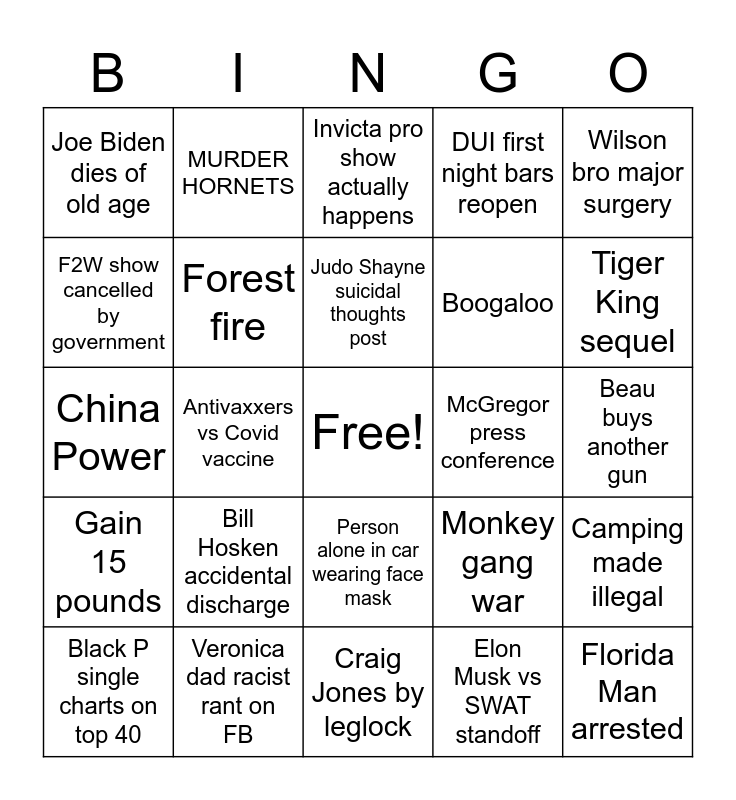 This bingo card has a free space and 24 words: Bill Hosken accidental discharge, Veronica dad racist rant on FB, Judo Shayne suicidal thoughts post, Black P single charts on top 40, Wilson bro major surgery, Joe Biden dies of old age, F2W show cancelled by government, MURDER HORNETS, McGregor press conference, Person alone in car wearing face mask, Boogaloo, China Power, Monkey gang war, Camping made illegal, Forest fire, Elon Musk vs SWAT standoff, Beau buys another gun, Invicta pro show actually happens, Tiger King sequel, Antivaxxers vs Covid vaccine, Florida Man arrested, Gain 15 pounds, DUI first night bars reopen and Craig Jones by leglock.