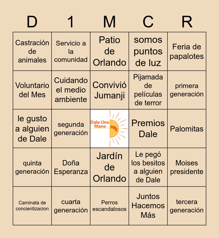 This bingo card has a free space and 25 words: Doña Esperanza, Perros escandalosos, Convivió Jumanji, Caminata de concientizacion, Feria de papalotes, Castración de animales, Voluntario del Mes, Servicio a la comunidad, Premios Dale, Jardín de Orlando, Pijamada de películas de terror, le gusto a alguien de Dale, Le pegó los besitos a alguien de Dale, Moises presidente, Cuidando el medio ambiente, Hacer obras de teatro, Palomitas, Patio de Orlando, primera generación, segunda generación, tercera generación, cuarta generación, quinta generación, somos puntos de luz and Juntos Hacemos Más.