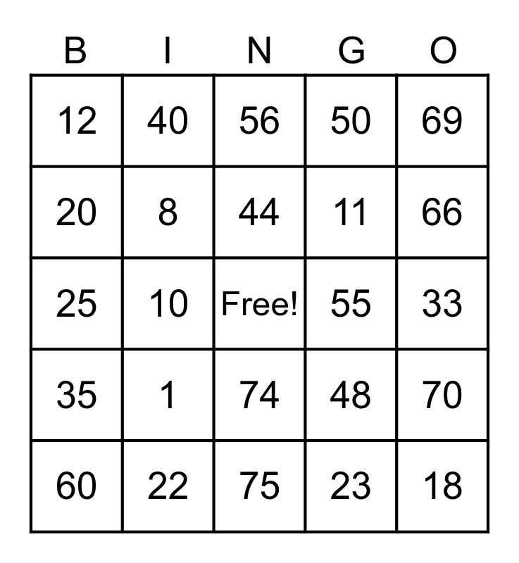 This bingo card has a free space and 24 words: 1, 22, 44, 60, 69, 12, 20, 40, 55, 74, 11, 25, 48, 70, 8, 23, 33, 56, 66, 10, 18, 35, 50 and 75.