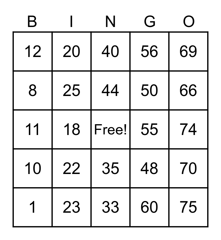 This bingo card has a free space and 24 words: 1, 22, 44, 60, 69, 12, 20, 40, 55, 74, 11, 25, 48, 70, 8, 23, 33, 56, 66, 10, 18, 35, 50 and 75.