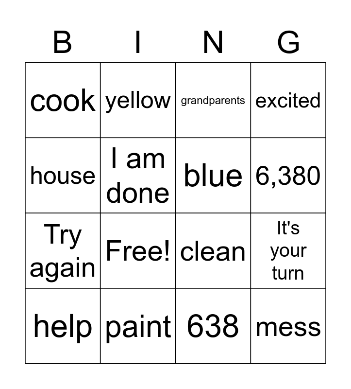 This bingo card has 16 words: paint, It's your turn, grandparents, cook, Try again, yellow, clean, 638, house, I am done, help, excited, Free!, 6,380, blue and mess.