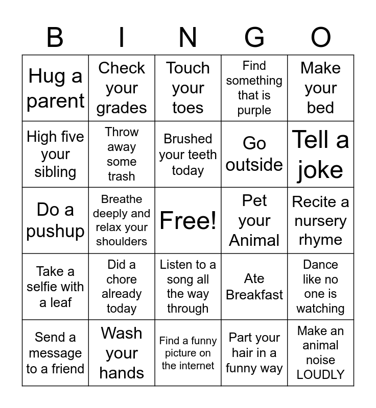 This bingo card has a free space and 29 words: Send a message to a friend, Say hi to someone you don't normally talk to, Breathe deeply and relax your shoulders, Do 10 jumping jacks, Hug a parent, Touch your toes, Throw away some trash, Did a chore already today, Pet your Animal, Wash your hands, Recite a nursery rhyme, Make an animal noise LOUDLY, Find a funny picture on the internet, Part your hair in a funny way, Tell a joke, Draw a picture of anything, Listen to a song all the way through, Take a selfie with a leaf, Make your bed, Do a pushup, Ate Breakfast, Say a nonsense word that doesn't mean anything, Go outside, High five your sibling, Find something that is purple, Check your grades, Dance like no one is watching, Brushed your teeth today and Spell your name backwards without a mistake.