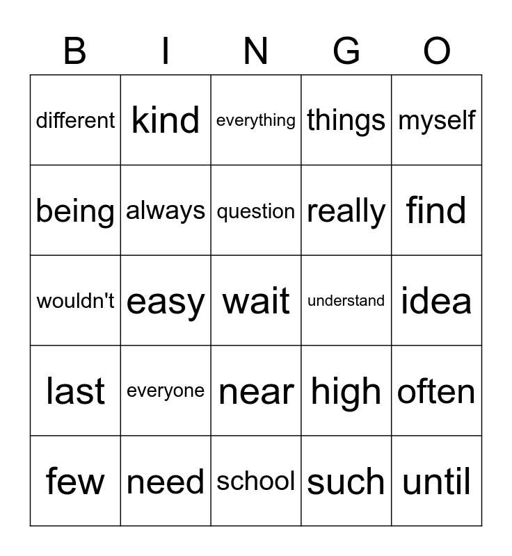This bingo card has a free space and 24 words: everyone, need, question, few, myself, different, being, kind, understand, near, really, wouldn't, high, often, always, such, idea, everything, find, easy, until, last, things and school.