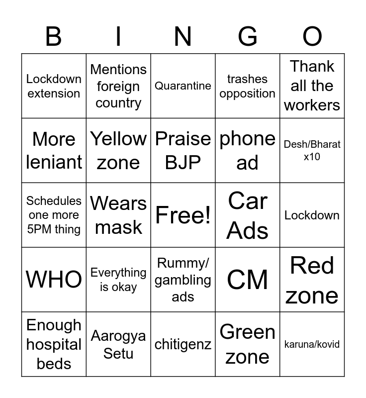 This bingo card has a free space and 24 words: Everything is okay, Aarogya Setu, Praise BJP, Enough hospital beds, Thank all the workers, Lockdown extension, More leniant, Mentions foreign country, Car Ads, Rummy/ gambling ads, phone ad, Schedules one more 5PM thing, CM, Red zone, Yellow zone, Green zone, Lockdown, Quarantine, Desh/Bharat x10, Wears mask, karuna/kovid, WHO, trashes opposition and chitigenz.