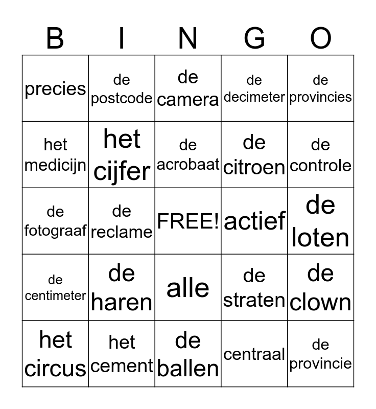 This bingo card has a free space and 61 words: de cel, het cement, de cent, de centimeter, centraal, het centrum, het cijfer, de cirkel, de citroen, december, de decimeter, de lucifer, het medicijn, de oceaan, de oceanen, precies, de provincie, de provincies, het recept, de acrobaat, actief, de camera, het circus, de clown, de club, de cola, het concert, het contract, de controle, controleren, correct, de disco, de directeur, het insect, de postcode, het product, het project, de reclame, de seconde, de fotograaf, grote, de haren, de loten, het mobieltje, de straten, de tenen, vele, de vogels, nemen, alle, de ballen, de ballon, dapper, kapotte, de puzzel, de strikken, witte, boffen, kussen, ezel and kikker.