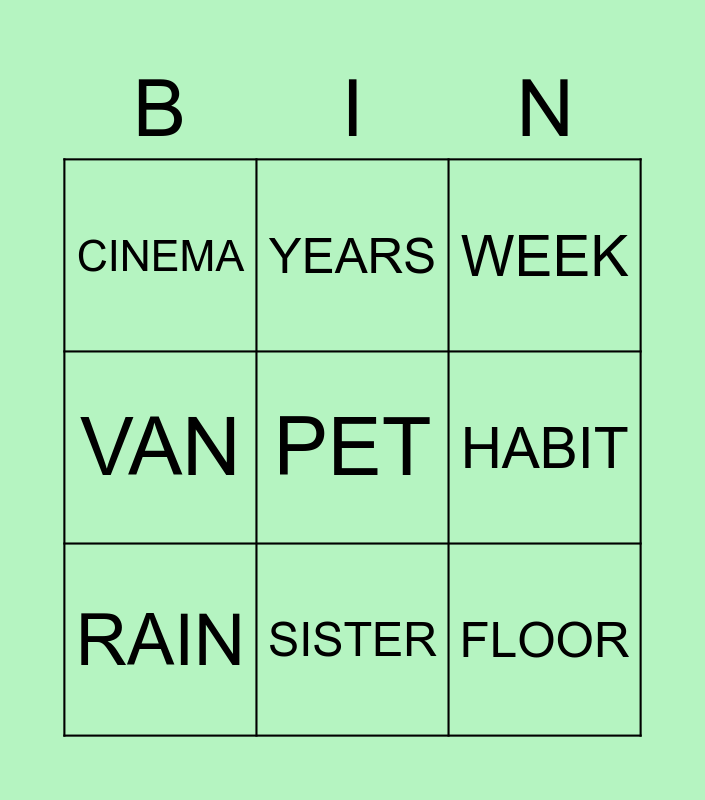 This bingo card has a free space and 8 words: HABIT, WEEK, YEARS, RAIN, CINEMA, FLOOR, VAN and SISTER.